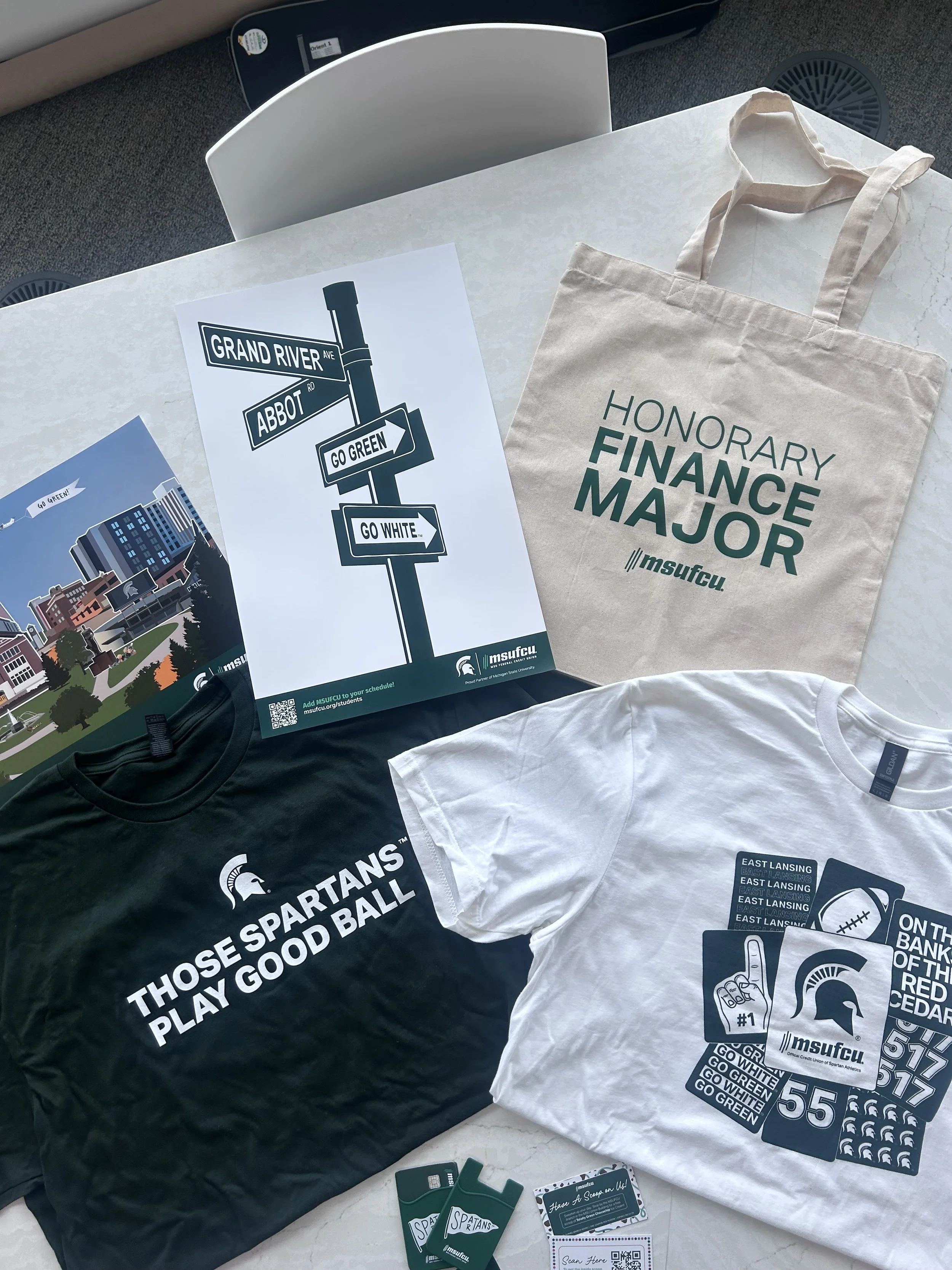 the design on the right was made for tote bags we handed out at michigan state events. we really wanted copy that related to our campaign “we major in spartans” that tried to entice our student members. i was very proud of “honorary finance major” and it ended up being a huge hit.