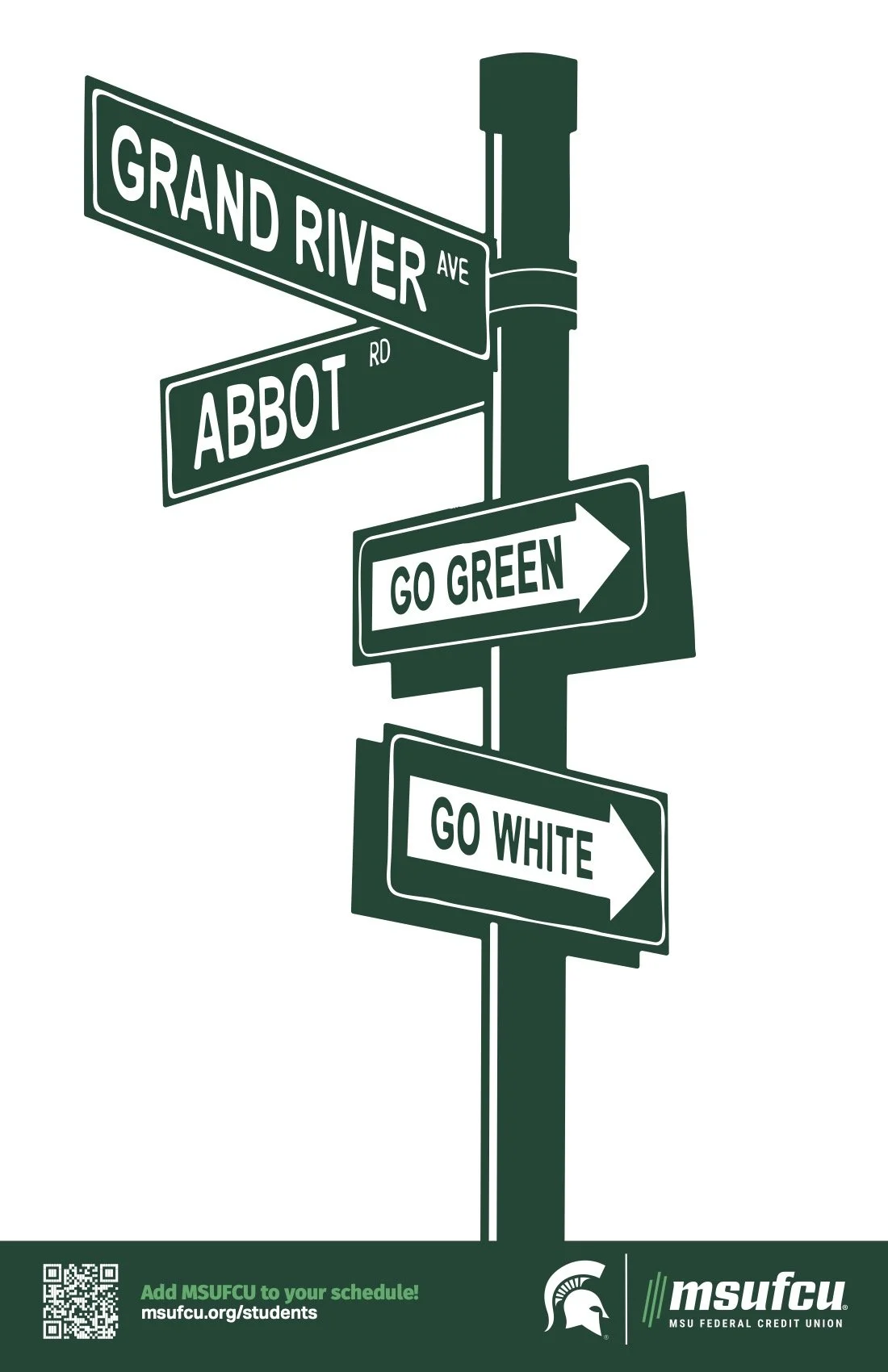 the design on the left is a poster of two main roads in east lansing that relate to the student population. we provided this for free at the annual michigan state poster sale.